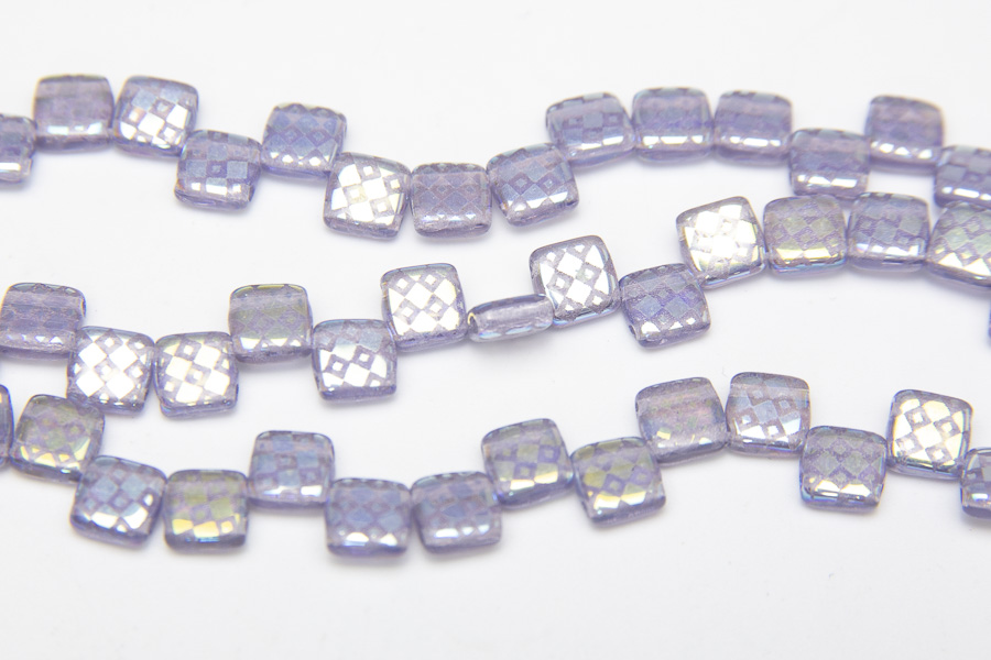 A 33 bead strand of Lavender Checker Stenciled 2-Hole Tiles made from the highest quality pressed Czech Glass. With 2 holes passing through each one, these beads are excellent for multistranded jewellery and bead weaving designs.