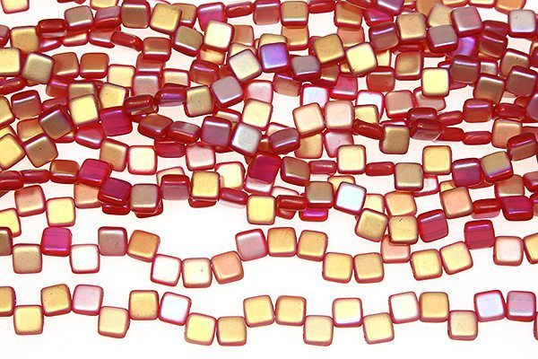 A 33 bead strand of Red Frosted AB 2-Hole Tiles made from the highest quality pressed Czech Glass. With 2 holes passing through each one, these beads are excellent for multistranded jewellery and bead weaving designs.
